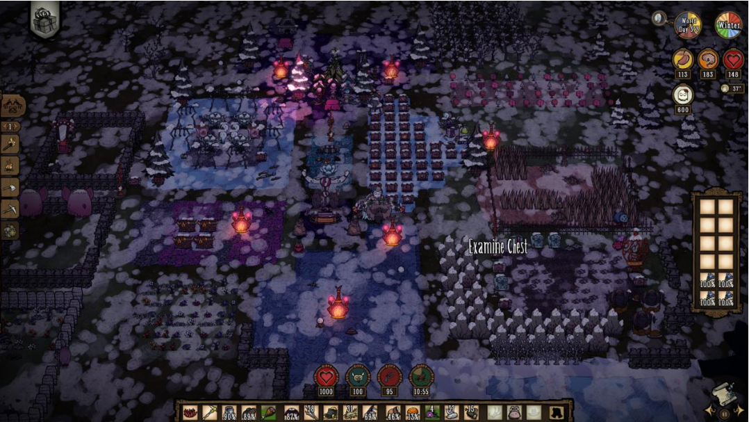 The core survival loop is still the same: gather resources during the day, build a fire at night, manage hunger and sanity, and prepare for the seasons. But in DST, this loop feels totally different because you are not doing everything on your own. Players naturally take on different roles, someone fights monsters, someone farms, someone explores, and someone handles crafting and supplies. Of course, teamwork doesn’t mean the game becomes easier. Winter can still freeze the whole team to death, and seasonal bosses can still destroy your base in seconds. But now you are dealing not only with the environment, but also with a world full of other players. Some teammates can carry the whole team, while others can burn down an entire forest by accident. You never know if your teammates are helping you or creating a second disaster.